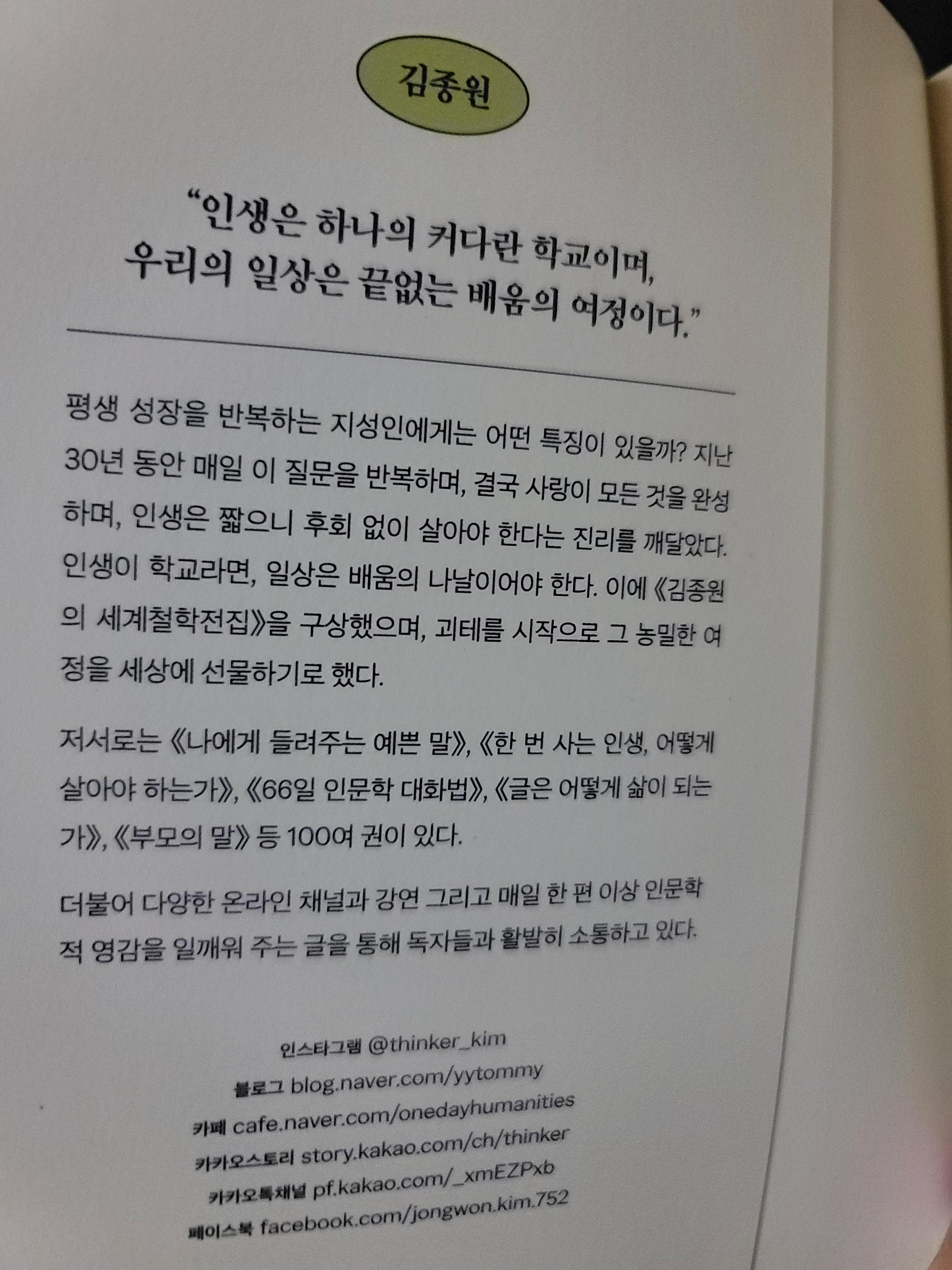 [도서] 책소개 인간은 노력하는 한 방황한다 by 개구쟁이Sun 2024. 6. 25. 반응형 김종원 지음M mindset18,800 원김종원의 세계철학전집X괴테 for 성장 반응형 공유하기 게시글 관리 인생 공부 중 '[도서] 책소개' 카테고리의 다른 글 싯다르타 (3) 2025.11.14 모비딕 (0) 2025.11.14 예언자 (0) 2025.11.14 인간실격 (0) 2025.11.14 무조건 1,000만원 벌고 시작하는 초수익 부동산경매의 기술 (0) 2024.06.25 관련글 모비딕 예언자 인간실격 무조건 1,000만원 벌고 시작하는 초수익 부동산경매의 기술